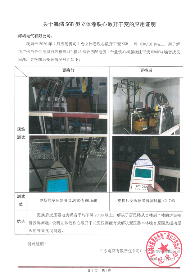 广州白云区白云雅苑10楼综合配电房内一台630kVA的叠铁心树脂浇注干变噪音过大,严重影响2-7楼居民日常休息。广州白云供电局选用杏耀平台登录入口电气SGB11-RL-630/10敞开式立体卷铁心干式变压器进行更换,更换后配电房噪音水平从66.5分贝降到42.7分贝。敞开式立体卷铁心干式变压器结构坚固稳定,有效解决变压器器身噪音原因及振动引起的噪音问题。