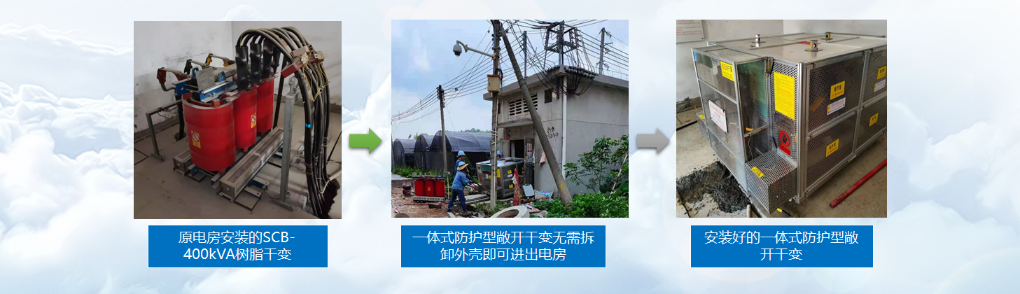 4、项目实现了干变运行过程中不停电更换风机,有效降低电网停电考核率。一体式防护型敞开干变外壳体积小,无需拆卸外壳即可进出电房,安装更方便,并且在安装过程为变压器提供有效防护。